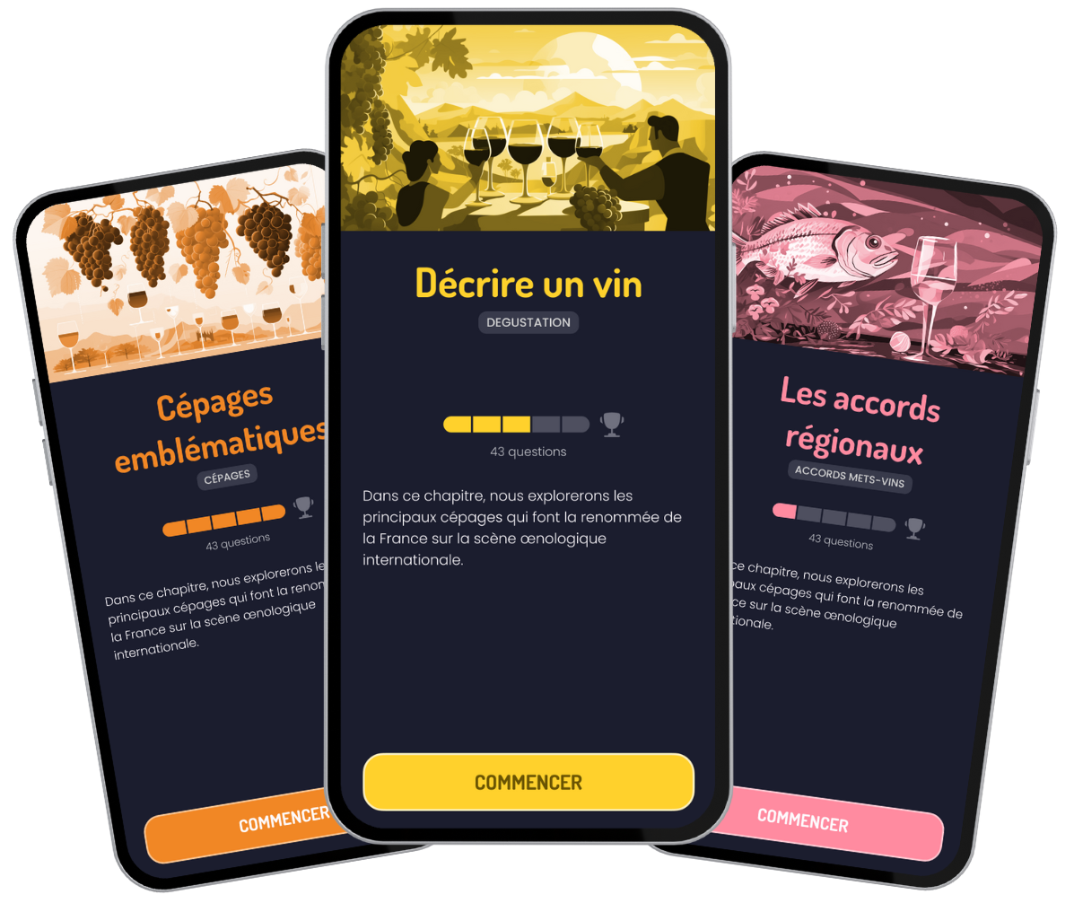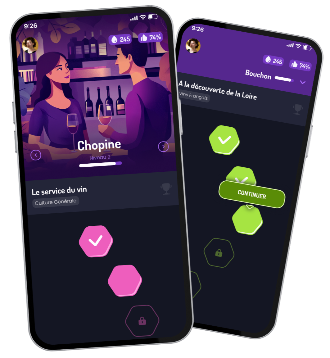 "Enfin un quizz digne de ce nom. Très belle application, simple, conviviale, éducative. Tous les amoureux du vin vont être ravis. Excellent travail ! Bouchon, Picolo et Chopine déjà faits. J'attends la suite avec impatience😀"