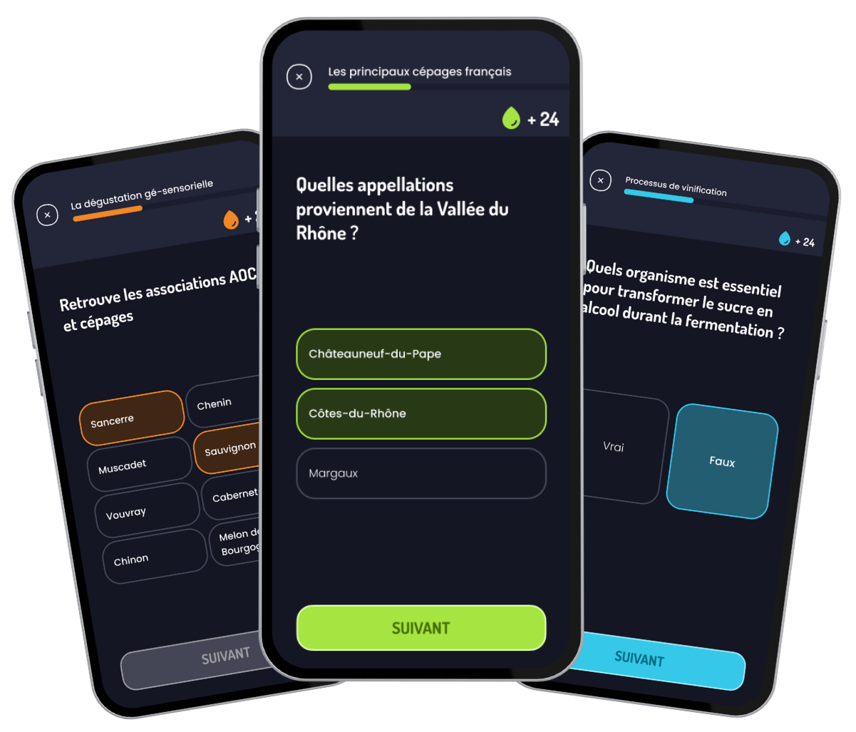"Enfin un quizz digne de ce nom. Très belle application, simple, conviviale, éducative. Tous les amoureux du vin vont être ravis. Excellent travail ! Bouchon, Picolo et Chopine déjà faits. J'attends la suite avec impatience😀"